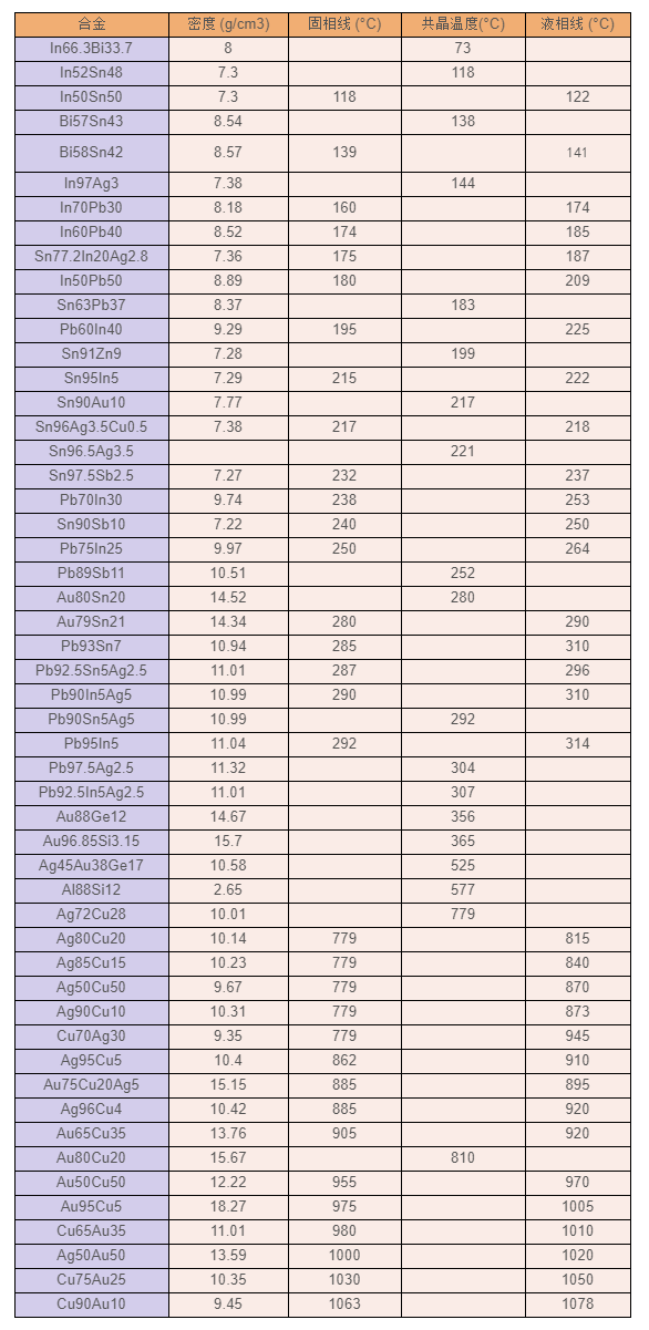 栢林電子致力于為電子封裝領(lǐng)域焊接用金屬預(yù)成型焊片、焊帶和焊絲的研發(fā)與生產(chǎn)。我們提供一系列不同熔點(diǎn)的焊料成分選擇,熔點(diǎn)范圍從50到1100°C,焊片最小厚度可達(dá)0.005mm,最小精度可達(dá)0.005mm,焊帶最小寬度0.2mm。典型焊料成分及性能如下表,如需完整合金表,請(qǐng)聯(lián)系我們的銷售代表。
