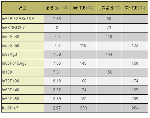 銦In熔點較低(為157℃),可與Sn、Pb、Ag等元素形成一系列低熔點共晶焊料,能夠避免在封裝焊接過程中高溫因素對產品的影響,銦In基焊料對堿性介質有較高的抗腐蝕性,對金屬和非金屬都具有良好的的潤濕能力,形成的焊點具有電阻低、塑性高等優(yōu)點,可用于不同熱膨脹系數材料的匹配封裝。因而銦In基焊料主要應用于電真空器件、玻璃、陶瓷和低溫超導器件的封裝上。純銦In和銦In基合金焊料具有優(yōu)異的熱傳導性,低熔點,極好的柔軟和延展性等特點,常用于如陶瓷元件搭接到PCB的連接材料和熱傳導材料。